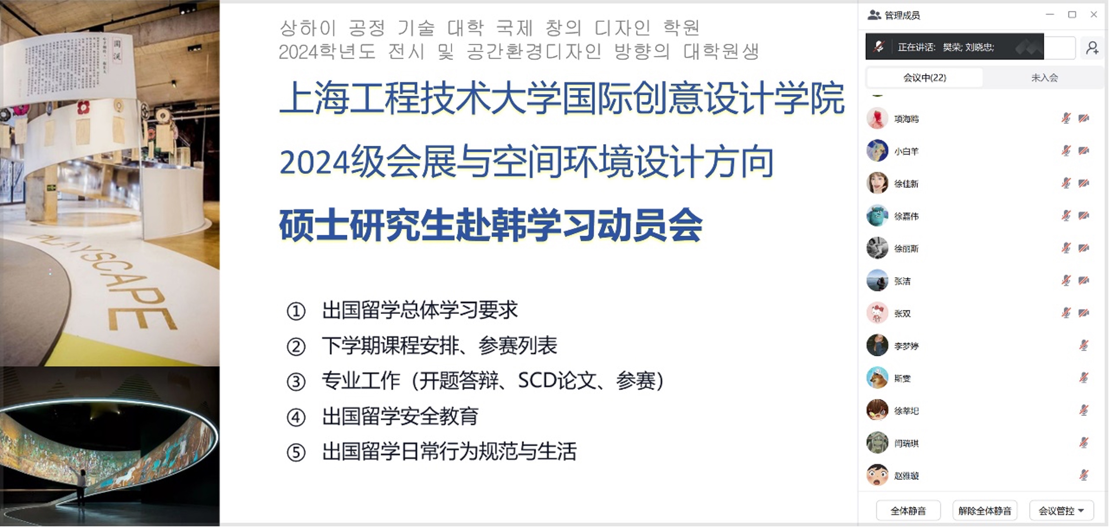 2025年8月28日晚上19:00,太阳成集团tyc7111cc以线上会议形式召开了“2024级会展与空间环境设计方向硕士研究生赴韩学习动员会”。太阳成集团tyc7111cc副经理樊荣、研究生秘书王冠夷、辅导员李志海、外事秘书刘晓忠及研究生导师咸妍、聂莎、徐嘉伟,会展方向全体赴韩研究生及部分员工家长出席会议,会议由樊荣副经理主持。