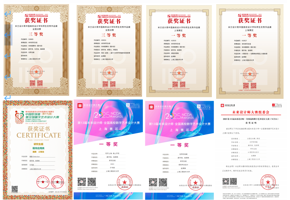 设计竞赛是颜宇涛检验学习成果、锤炼实践能力的重要平台。2024-2025 学年,他以 “实践出真知、创新解难题” 为核心思路,在多项高水平赛事中突破自我。备战 2025 第 13 届未来设计师・全国高校数字艺术设计大赛时,他以 “让蜀绣非遗通过数字设计走进现代生活” 为核心思路,将传统蜀绣纹样拆解为可编辑的数字元素,通过交互设计让作品能自主组合纹样、模拟刺绣过程,直观感受蜀绣技艺的精妙。,最终以第一作者身份凭借作品斩获国家级二等奖、省级一等奖;同时,他作为第二作者参与的另一项作品,因在 “老年友好型社区设计” 中的创新表达,获国家级三等奖。在后续的米兰设计周中国高校设计学科师生优秀作品展中,均获国家级三等奖,其中一项还获省级一等奖;在中国好创意(第十九届)暨全国数字艺术设计大赛中,他以 “智能生活场景下的设计优化” 为核心,独立完成的作品获国家级三等奖,作为第二作者参与的团队作品,因精准把握用户需求获国家级二等奖。一次次参赛经历,不仅让他的设计思维更具逻辑性与系统性,更让他在团队协作、问题解决等方面的能力得到全方位提升。